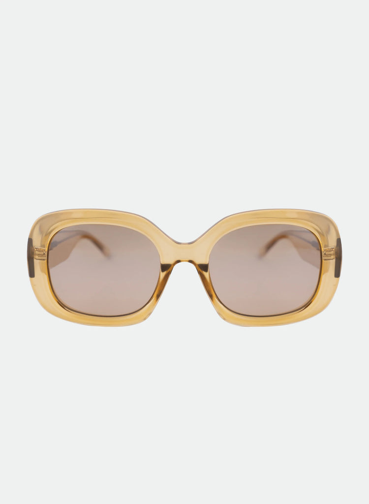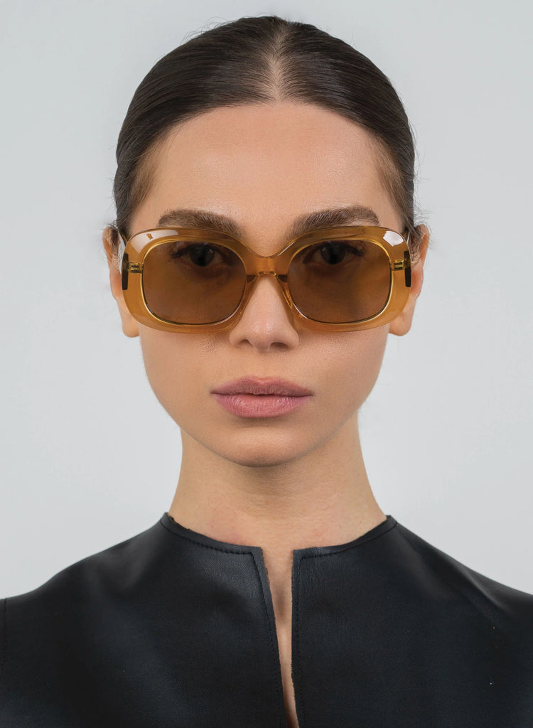 Bold yet elegant, Valerie features a statement thick rounded frame in shiny Transparent Gold, paired with a subtle light Khaki flash lens.