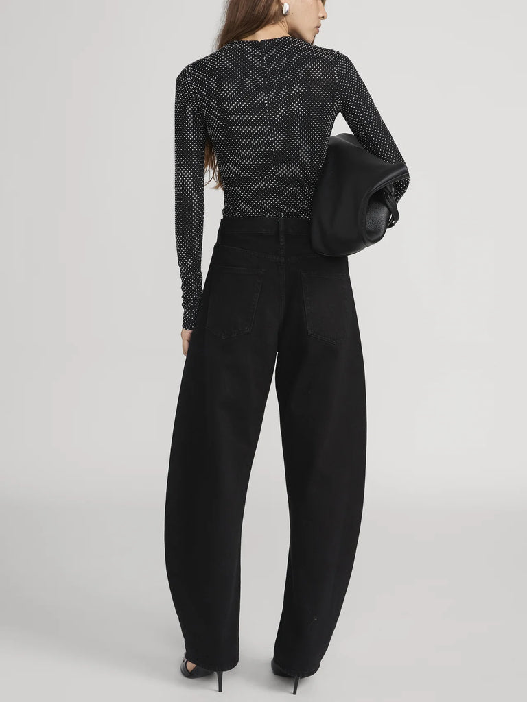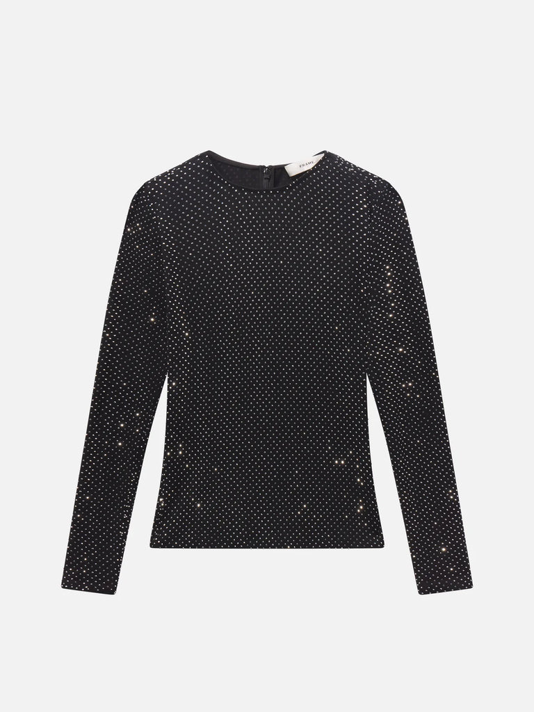 Expect compliments. This form-fitting black top features all-over micro rhinestone detailing that evokes the night sky. Crafted in an effortless jersey knit with a sleek back seam and finished with a zip closure.