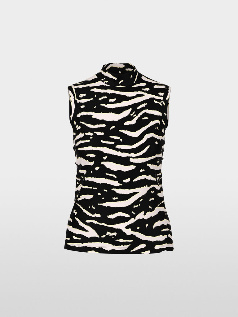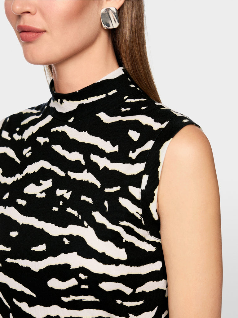 This sleeveless top impresses with its figure-hugging shape and trendy animal print. It comes with a small stand-up collar and a fine rib knit. The soft material mix with cotton is comfortable to wear against the skin. The perfect basic shirt to enhance any outfit.