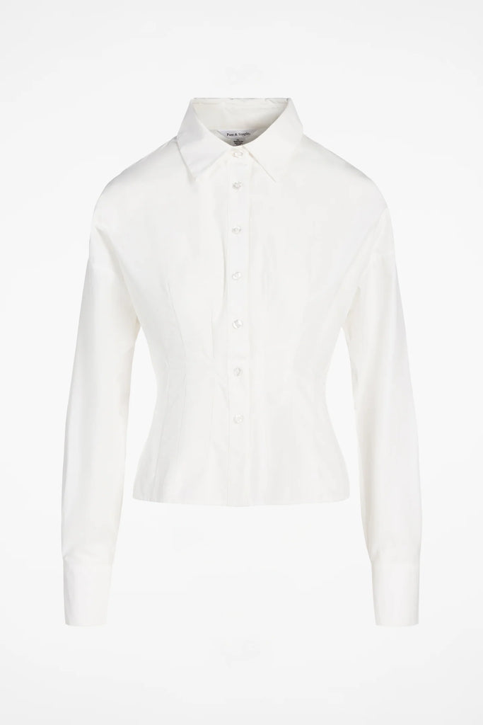 The Belfast Cinched Waist Shirt is a polished update to the classic button-down, crafted from soft, breathable cotton poplin with a refined, structured drape. Featuring a cover-elastic cinched waist that naturally defines the silhouette and a modern high–low hem, it moves from work to weekend with ease.