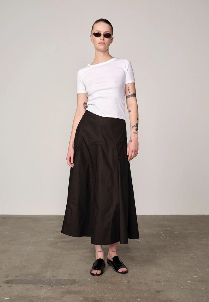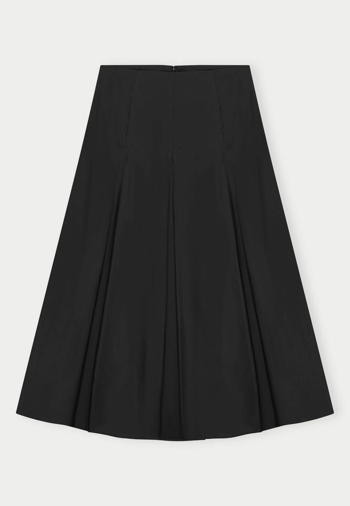 A structured cotton skirt with flattering volume and mid-length cut. Designed for ease and polish in equal measure.