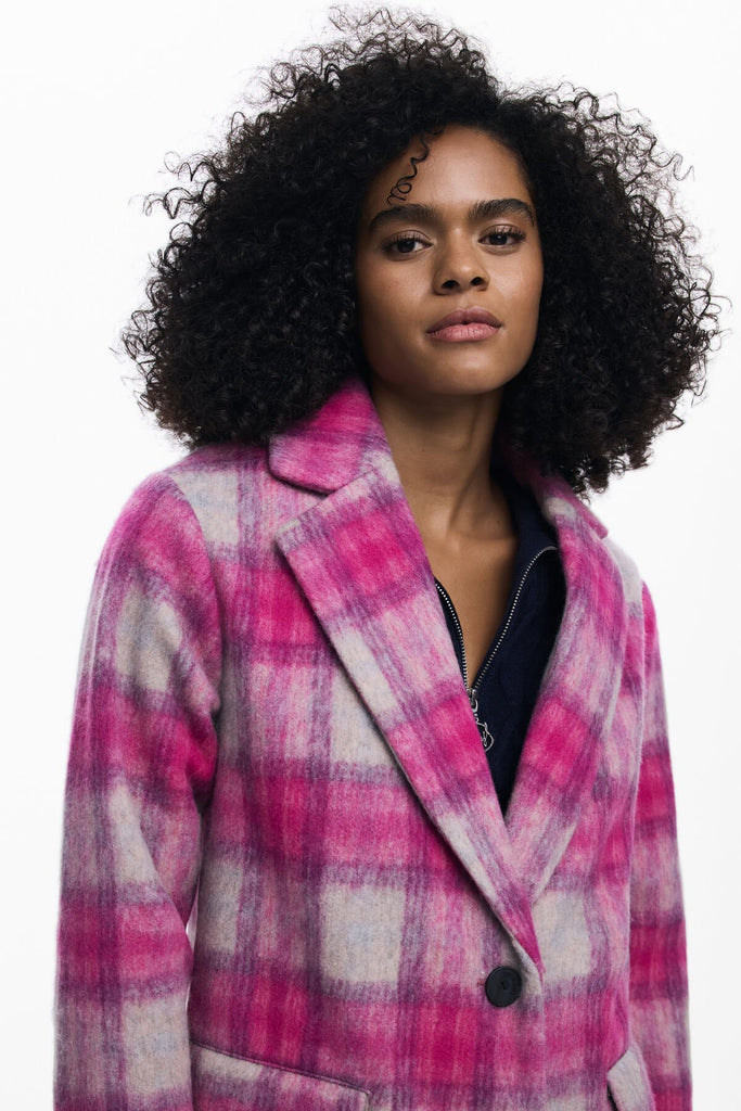 Long coat with V lapel collar, front pockets, and large tartan print.