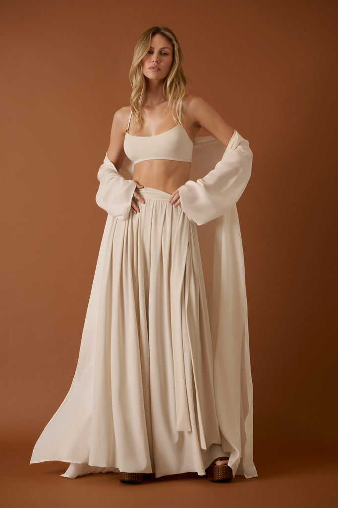 Wide-leg palazzo pants designed for graceful, elegant movement. The flowing silhouette embodies effortless sophistication and comfort.