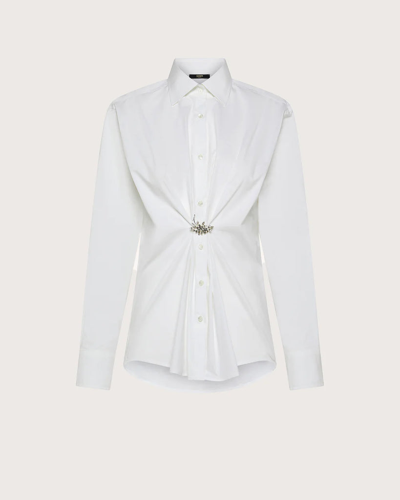 Long-sleeve poplin button-down shirt with gathering detail at waist and removable crystal broche.