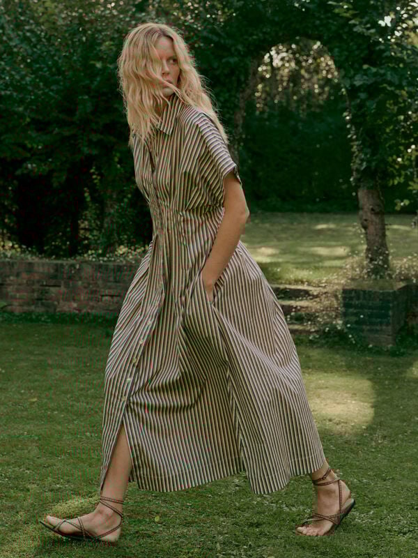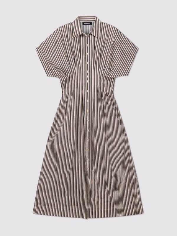 Crafted from a breathable elastic cotton mix with a smooth stretch weave and crisp vertical stripes. A relaxed, flared A-line silhouette features a button-down front, basic shirt collar, short cape sleeves, side seam pockets and a rounded hem at mid-calf. From REPEAT cashmere, ideal for office, travel and layering.