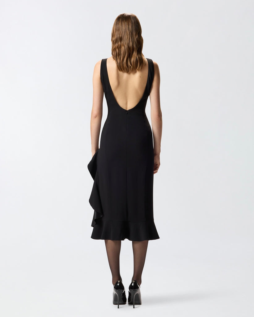 Long sleeveless dress with a deep neckline on the back, made from stretch viscose fabric, which translates into an optimal fit. The material has been designed to perfectly adhere to the lines of the body, enhancing the silhouette in a natural and defined way. Laser-etched spiral flounces paired with satin create shiny/matte contrast that enhances the texture of the fabric. The mix of shapes adds movement to this refined look, without losing a structured and feminine final effect.